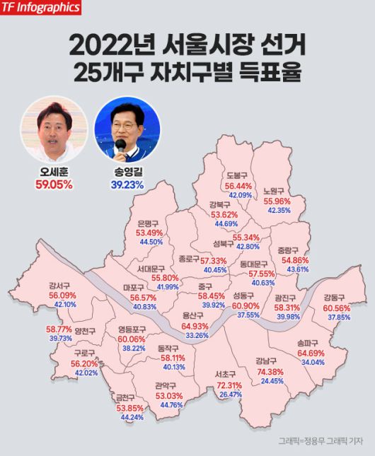 3년 전인 2022년 6월 1일 지방선거에서는 오 시장이 서울에서 59.05%의 득표율로 송영길 민주당 후보(39.23%)를 압도하며 25개 자치구 전역에서 승리했다. 강남구(74.38%), 서초구(72.31%)는 물론, 진보세가 강한 관악구(53.03%)와 은평구(53.49%)에서도 우세를 점했다.