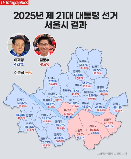 [더팩트ㅣ정소양·설상미 기자] 제21대 대통령 선거에서 이재명 대통령이 당선된 가운데, 이 대통령은 서울에서도 과반에 가까운 지지를 받으며 1위를 차지했다. 특히 서울은 불과 3년전 지방선거에서 오세훈 서울시장이 서울 25개 전 자치구를 석권했던 점을 고려하면, 이번 대선 결과는 정권심판 여론이 서울 민심을 크게 흔들었음을 보여준다.