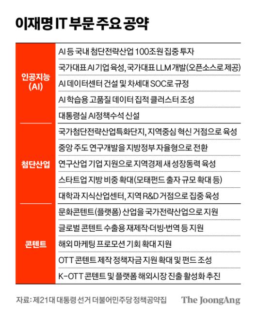 이 대통령은 앞서 공약을 통해 “대규모 국민펀드를 조성해 AI 등 국내 첨단전략산업에 100조원을 집중 투자하겠다”고 발표했다. 최신 그래픽처리장치(GPU)를 탑재한 AI 데이터센터를 건설해 이른바 ‘AI 고속도로’를 세우고, 국가대표 AI 기업(가칭 ‘K-미스트랄’)을 육성하겠다는 내용이 핵심이다. 일관성 있는 정책 추진을 위해 대통령실에는 국가최고인공지능책임자(CAIO)인 ‘AI정책수석’을 신설하는 등 AI 컨트롤타워를 구축해 나간다는 계획이다.
