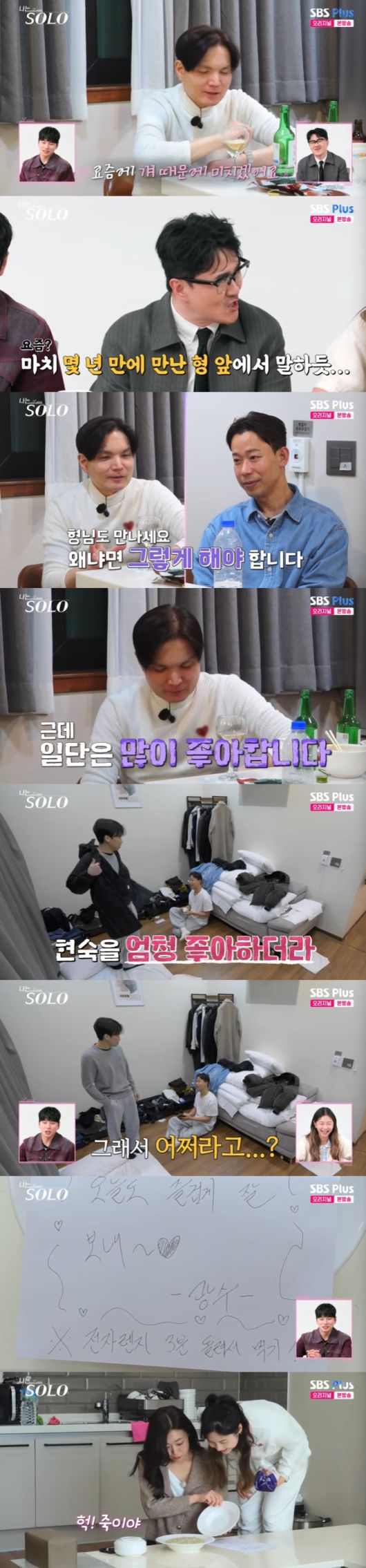 광수는 "현숙은 정말 내가 좋아한다. 형님도 만나라. 그렇게 해야 한다"라면서도 "일단은 많이 좋아한다"라며 견제했다.
