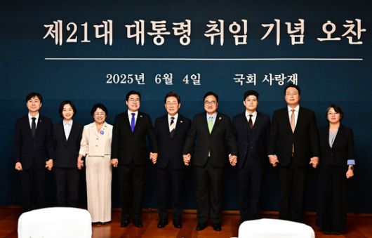 이재명 대통령이 4일 오후 서울 여의도 국회 사랑재에서 우원식 국회의장이 준비한 제21대 대통령 취임 기념 오찬에 참석해 사진 촬영을 하고 있다. 왼쪽부터 한창민 사회민주당 대표, 김재연 진보당 대표, 김선민 조국혁신당 대표 권한대행, 박찬대 더불어민주당 원내대표, 이 대통령, 우 의장, 김용태 국민의힘 비대위원장, 천하람 대표 권한대행 겸 원내대표, 용혜인 기본소득당 대표. 임현동 기자 |
