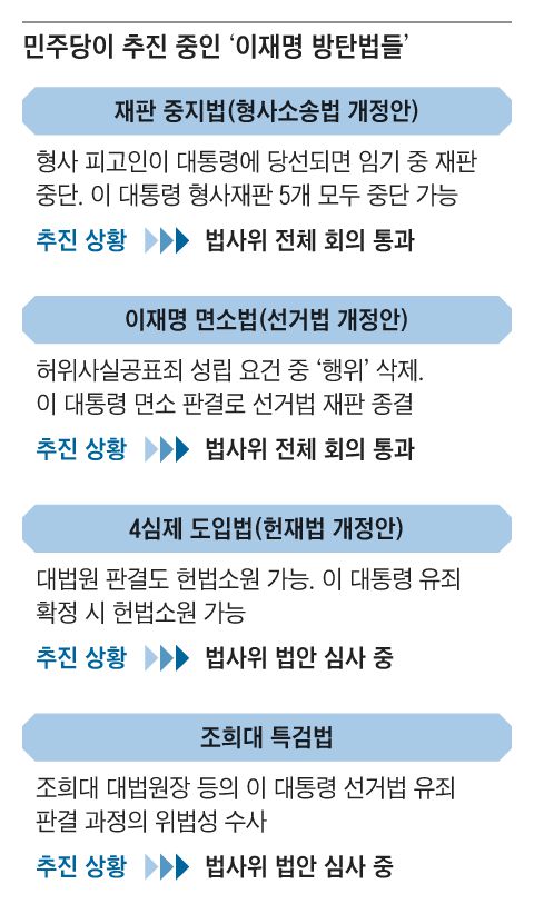 법조계에선 이들 법안에 헌법적 쟁점이 많아 야당과 시민단체가 헌법소원을 낼 수 있고, 헌재가 위헌 여부를 판단할 것으로 본다. 고법 부장 출신 변호사는 “형소법 개정안의 경우 ‘대통령은 재직 중 소추받지 않는다’는 헌법 84조에 재판이 포함되는지 헌재 판단이 필요하다”고 했다. 검사장 출신 변호사는 “선거법 개정안은 특정인을 처벌하지 않기 위한 법”이라며 “헌법상 평등권에 반할 수 있다”고 했다. 법조계 관계자는 “헌재가 이 대통령의 헌법재판관 2명 임명으로 ‘9인 체제’가 되길 기다릴 수 있다. 진보 성향 재판관이 많아지면 민주당에 유리할 것”이라고 했다.