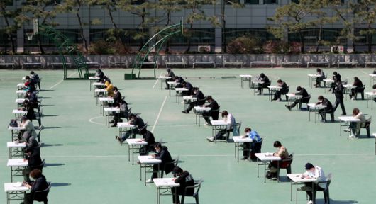 코로나19 유행 당시인 지난 2020년 4월 서울 서경대 캠퍼스 야외운동장에서 손해보험 설계사 자격시험이 치러지고 있다. 사진은 기사와 무관. 중앙포토 |