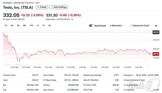 4일(현지시간) 뉴욕증시에서 테슬라는 3.55% 급락한 332.05달러를 기록했다. 이로써 시총도 1조700억달러로 줄어 1조달러를 겨우 턱걸이했다. 테슬라는 장 초반 5%까지 급락했었다.