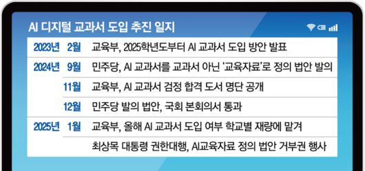 4일 교육계에 따르면 윤석열 정부는 올해 3월부터 전국 초등학교 3·4학년과 중학교 1학년, 고등학교 1학년 영어·수학·정보 과목에 AI 교과서를 도입했다. 당초 윤석열 정부는 AI 교과서를 전국 모든 학교의 해당 학년에 ‘전면 도입’한다는 계획이었지만, 교원·학부모들의 우려와 더불어민주당의 강한 반발에 올해는 ‘학교 자율’에 따라 시범 도입하고 차차 도입 범위를 확대한다는 계획이었다.