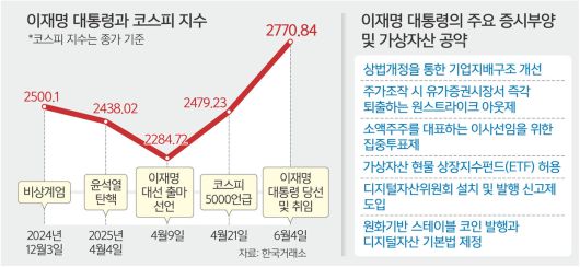 이재명 대통령 임기가 시작되면서 이른바 ‘오천피’(코스피 지수 5000) 공약에 대한 시장의 기대감도 커지고 있다. 그간 유가증권시장을 뒤흔들었던 국내 정치 불확실성이 종식됐고 30조원이 넘는 규모의 2차 추가경정예산(추경) 등 호재가 예상되면서 미국발 관세전쟁으로 침체기를 겪던 코스피에 장밋빛 전망이 나오고 있다. 가상자산 정책도 그동안 규제 위주였으나 새 정부가 지원에 무게를 두고 있어 업계에 훈풍이 불 것으로 보인다.