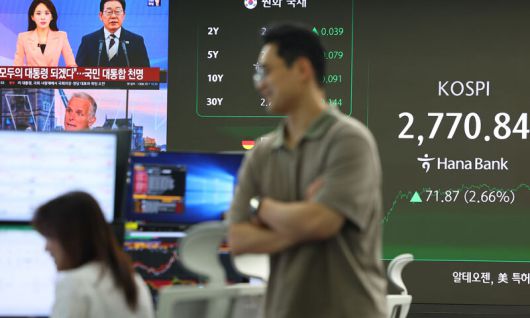 4일 서울 중구 하나은행 딜링룸 스크린에 코스피 지수와 이재명 대통령 취임 관련 뉴스가 표시돼 있다. 연합뉴스 |