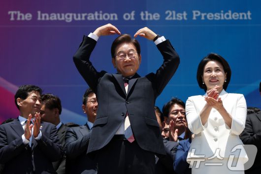 이재명 대통령과 김혜경 여사가 4일 서울 여의도 국회 로텐더홀에서 취임 선서를 마치고 나와 잔디광장에 모인 시민들을 향해 하트를 만들어 보이고 있다. 2025.6.4/뉴스1 ⓒ News1 국회사진기자단 |