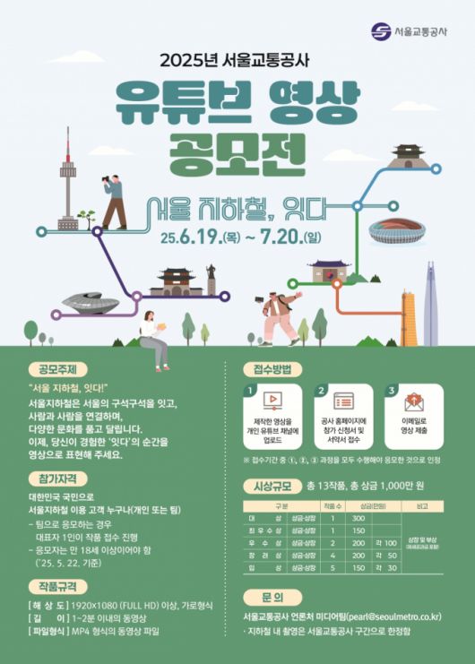서울교통공사는 '2025년 유튜브 영상 공모전'을 개최한다고 5일 밝혔다. 시민의 시선으로 재해석된 서울지하철의 연결과 소통을 담아내기 위해 진행하는 공모전이다. 접수 기간은 오는 19일부터 다음달 20일까지다.