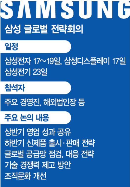 5일 재계에 따르면 삼성전자는 17~19일 사흘간 주요 경영진과 해외 법인장 등이 참석한 가운데 글로벌 전략회의를 진행한다. 삼성의 글로벌 전략회의는 매년 6월과 12월 두 차례 국내외 회사 임원급이 모여 사업 부문별 업황을 점검하고 사업 계획에 대한 의견을 나누는 자리다.