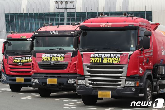 안전운임제 확대와 일몰제 폐지 등을 요구하는 민주노총 공공운수노조 화물연대본부(화물연대)의 총파업이 닷새째로 접어든 지난 2022년 11월 28일 대구의 한 화물차 차고지에 총파업 현수막을 붙인 유조차 등 화물차 여러 대가 주차된 모습. 2022.11.28/뉴스1 ⓒ News1 공정식 기자 |