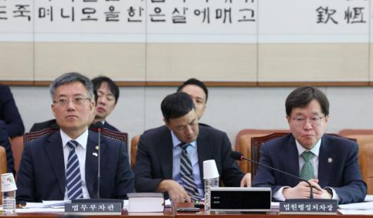 배형원 법원행정처 차장과 김석우 법무부차관이 7일 서울 여의도 국회에서 열린 법제사법위원회 제1차 법안심사제1소위원회에 출석해 있다. 뉴스1 |