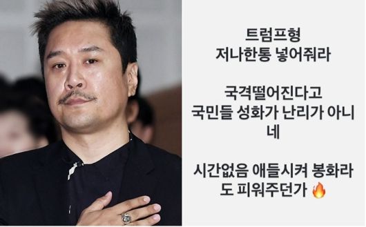JK김동욱은 5일 SNS에 “트럼프형 전화 한 통 넣어줘라. 국격 떨어진다고 국민들 성화가 난리가 아니네. 시간 없으면 애들 시켜 봉화라도 피워주던가”라는 글을 게재했다.