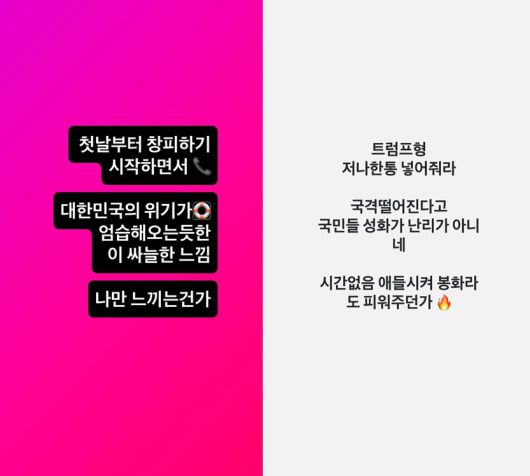 이어 4일에는 "첫날부터 창피하기 시작하면서"라는 글과 함께 전화기 이모티콘을 게재, "대한민국의 위기가 엄습해오는 듯한 이 싸늘한 느낌 나만 느끼는 건가"라고 덧붙였다.