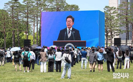 5일, 북한 관영매체 <조선중앙통신>이 이재명 대통령 당선을 보도하며 한국의 제21대 대통령선거에 대해 처음 언급했다. 사진은 지난 4일, 서울 여의도 국회 잔디밭서 시민들이 이 대통령 취엄 선서 중계를 시청하는 모습 ⓒ문경덕 기자