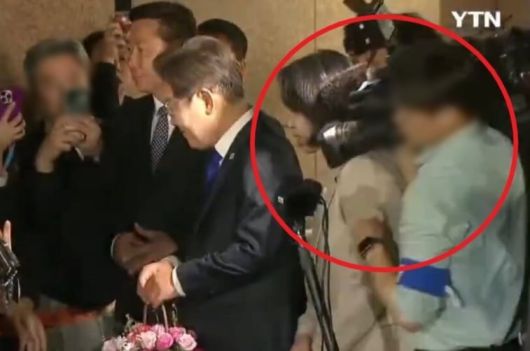 앞서 3일 밤 이 대통령 내외는 당선이 확실시되자 인천시 계양구 사저 밖으로 나와 시민들과 인사를 나눴다. 이때 생중계를 위해 카메라를 들고 촬영하던 기자가 이 대통령에게 가까이 다가가다가 김 여사를 밀치는 장면이 포착됐다.