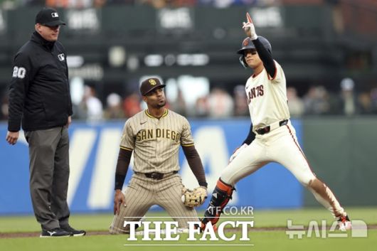 이정후가 5일(한국시간) 샌디에이고전에서 1회말 2루타를 때려낸 뒤 2루에 안착하고 있다. /샌프란시스코=AP.뉴시스 |