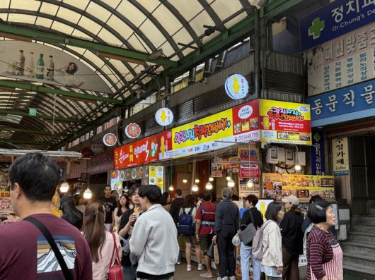 [파이낸셜뉴스] #.평일 오후 2시, 광장시장 북문 앞은 찹쌀 꽈배기를 든 사람들로 인산인해를 이뤘다. '광장시장 찹쌀 꽈배기 줄 서는 곳입니다'라는 표지판 뒤로 스무 명 이상의 손님들이 차례를 기다렸고, 꽈배기를 든 채 시장을 배경 삼아 사진을 찍는 청년들도 보였다. 광장시장에서 만난 곽채린씨(22)는 들뜬 표정으로 "주변 친구들도 시장에 많이 놀러 오는 편이다. 사회관계망서비스(SNS)에서 전통시장 맛집 관련 게시물을 많이 봤다"고 말했다.