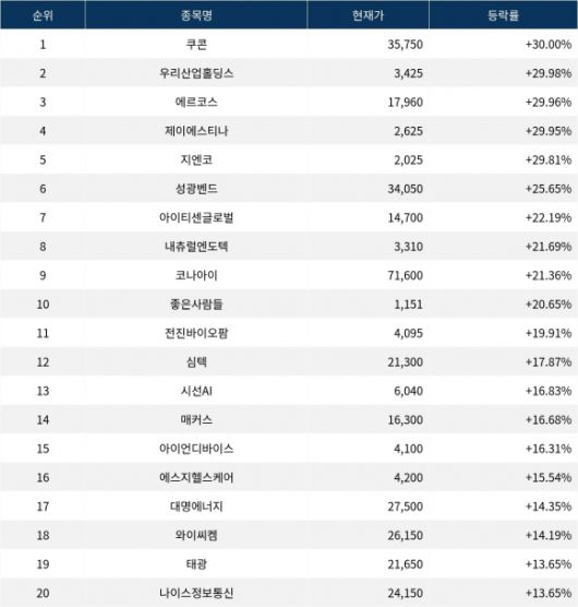 6위 성광벤드(014620)는 종가 34,050원으로 25.65% 상승 마감했다. 7위 아이티센글로벌(124500)은 종가 14,700원으로 22.19% 상승 마감했다. 8위 내츄럴엔도텍(168330)은 종가 3,310원으로 21.69% 상승 마감했다. 9위 코나아이(052400)는 종가 71,600원으로 21.36% 상승 마감했다. 10위 좋은사람들(033340)은 종가 1,151원으로 20.65% 상승 마감했다.