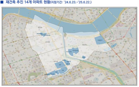 이처럼 아파트값이 요동치자 서울시는 이날 강남·송파구 재건축 추진 아파트 14곳을 토허구역으로 재지정했다. 강남권 상승세가 서울 전역으로 옮아갈 조짐을 보이자 핵심 지역인 잠삼대청 일대(1.43㎢) 토허구역 효력을 1년 더 유지하기로 한 것이다. 이번 결정으로 이달 22일까지였던 토허구역 효력이 내년 6월 22일까지 연장된다. 잠삼대청은 2020년 6월 23일부터 토허구역으로 묶여있다. 2월 국제교류복합지구 및 인근지역 일부가 토허구역에서 한 달여 간 해제될 당시에도 14개 단지들은 규제를 유지했다.