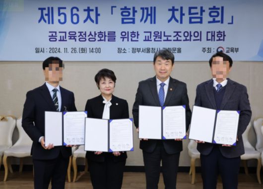 이주호 교육부 장관(오른쪽에서 두 번째)이 조윤희 대한국민교원조합 상임위원장(왼쪽에서 두 번째)와 함께 차담회에서 만나 기념사진을 찍고 있다. 대한교조 홈페이지 갈무리 |