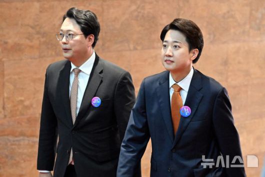 [서울=뉴시스] 국회사진기자단 = 개혁신당 이준석 의원과 천하람 의원이 4일 서울 여의도 국회 로텐더홀에서 열린 제21대 대통령 취임선서에 참석하고 있다. 2025.06.04. photo@newsis.com |