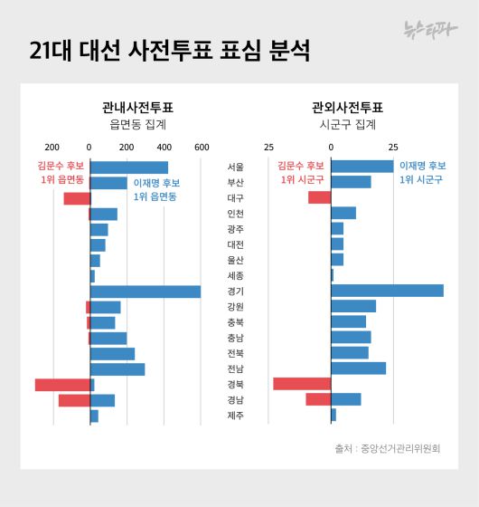 21대 대선에서 총 투표 3,523만 표 중 사전투표는 모두 1,530만 표였다. 이중 이재명 후보가 975만 표를 득표해 64%를 차지했다. 김 후보는 404만 표를 얻어 26.4%에 그쳤다. 이재명 후보는 관내사전투표와 관외사전투표를 가리지 않고 우세를 보였다.사전투표는 관내사전투표와 관외사전투표로 나뉘어 집계된다. 본인이 거주하는 시군구 지역 내에서 사전투표를 하면 관내사전투표가 되고 그 외 지역에서는 관외사전투표가 된다. 관내사전투표는 읍면동 단위로 집계되는 반면, 관외사전투표는 시군구 단위까지만 집계된다.