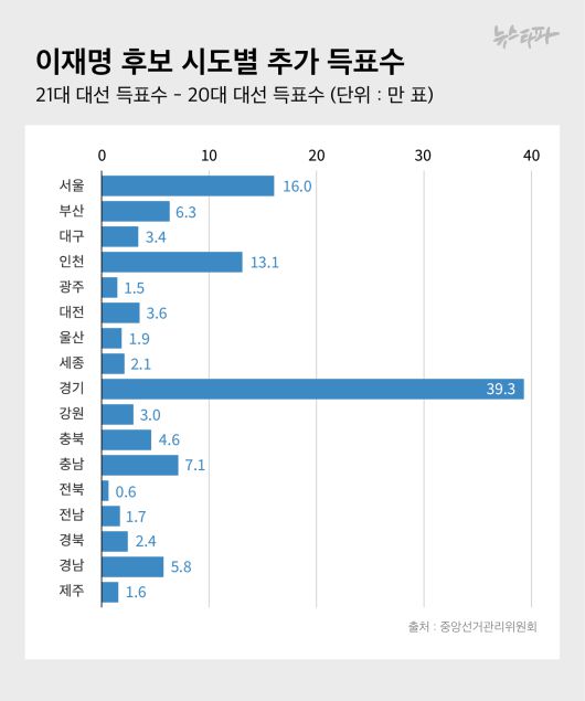 이재명 후보는 지난 20대 대선에서 1,614만 표(47.83%)를 득표했지만, 1,639만 표(48.56%)를 받은 윤석열 후보에게는 못미쳤다. 이번 선거에서 이 후보는 1,728만 표를 얻었다. 지난 20대 대선 윤석열 후보의 득표수보다 89만 표 많다.이재명 후보의 21대 대선과 20대 대선 득표수 차이를 시도별로 비교했을 때, 가장 큰 차이가 나타난 지역은 경기도였다. 이 후보는 21대 대선에서 39만 표를 더 얻었다. 서울이 16만 표, 인천이 13만 표로 뒤를 이었다. 수도권 추가 득표수를 합치면 68만 표로, 이 후보가 새로 얻은 114만 표의 60% 수준이다.