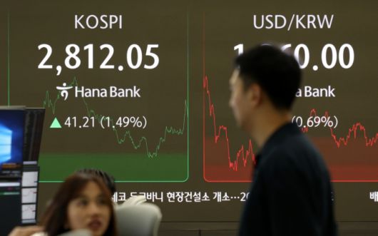 코스피가 전 거래일(2770.84)보다 41.21포인트(1.49%) 오른 2812.05에 마감한 5일 오후 서울 중구 하나은행 딜링룸 전광판에 지수가 표시되고 있다. 코스닥 지수는 전 거래일(750.21)보다 6.02포인트(0.80%) 상승한 756.23, 서울 외환시장에서 원·달러 환율은 전 거래일(1369.5원)보다 11.1원 내린 1358.4원에 주간 거래를 마감했다./사진=뉴시스 |