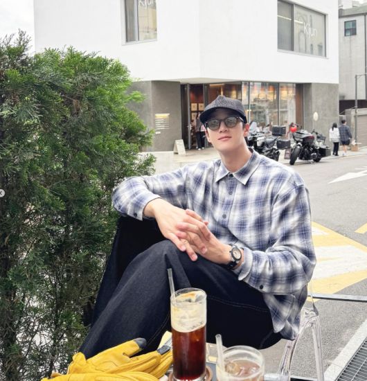 체크 셔츠와 모자, 캐주얼한 시계 등 자연스러운 스타일링이 눈길을 끈다. 테이블 위에는 음료와 바이크 장갑이 놓여 있어, 라이딩을 앞둔 설렘과 일상의 소소한 힐링이 느껴진다.