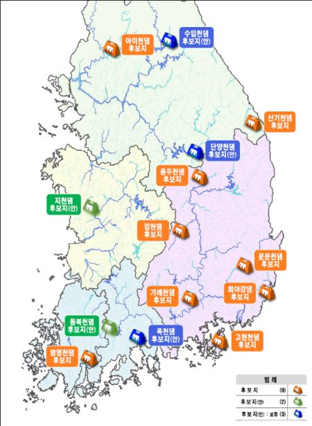 지난 3월 환경부는 기후대응댐 14곳 후보지 중 주민 반대가 큰 5곳을 제외하고 9곳에서 댐 사업을 추진하기로 결정했다. 후보지는 △연천 아미천댐 △삼척 산기천댐 △예천 용두천댐 △거제 고현천댐 △김천 감천댐 △의령 가례천댐 △울산 회야강댐 △청도 운문천댐 △강진 병영천댐이다.