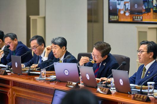 이재명 대통령이 5일 용산 대통령실에서 취임 후 첫 국무회의를 주재하며 장관들과 함께 김밥을 먹고 있다. 오전 10시에 시작된 회의가 3시간 넘게 진행되며 이 대통령과 장관들은 김밥으로 점심을 대신했다. 이날 국무회의에는 이주호 사회부총리 겸 교육부 장관(오른쪽 셋째), 조태열 외교부 장관(오른쪽 넷째) 등 전 정부에서 임명된 장관들이 참석했다. 대통령실 |