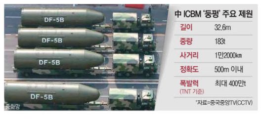5일 홍콩 사우스차이나모닝포스트(SCMP)에 따르면, 중국중앙TV(CCTV)는 지난 2일 중국의 첫 대륙간탄도미사일(ICBM) 둥펑(DF)-5에 대해 "TNT 폭발력 300만~400만t급 핵탄두 1기를 탑재할 수 있다"고 전했다.