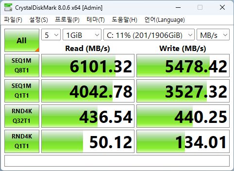 스토리지는 PCIe 4.0 규격의 1TB SSD가 기본 탑재된다. 크리스탈 디스크마크로 SSD의 성능을 확인해보니, 연속 읽기 속도 6,101MB/s, 연속 쓰기 속도 5,478MB/s로 확인됐다.
