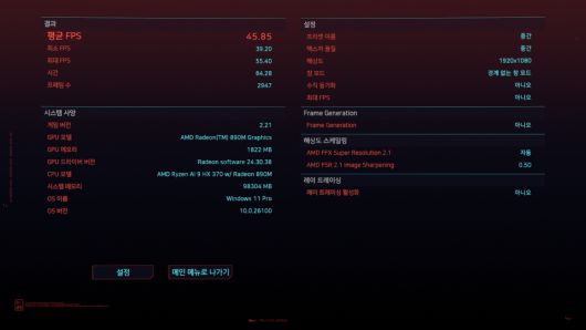 사이버펑크 2077 벤치마크를 구동했다. FHD 해상도에 중간 옵션으로 구동해본 결과 평균 프레임 45.85, 최소 프레임 39.2, 최대 프레임 55.4를 기록했다.