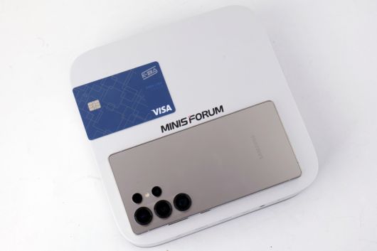 신용카드와 갤럭시 S25 울트라를 통해 사이즈를 비교해봤다. 가로 세로 길이는 19.5cm다. 모니터 받침대 같은 곳에도 충분히 수납할 수 있을 정도로 아담한 사이즈인 만큼 데스크테리어를 중시하는 이들에게 더욱 매력적일 것이다.