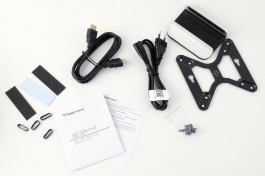 미니 PC 본체를 제외한 구성품부터 살펴보자. 매뉴얼, VESA 마운트, HDMI 케이블, 버티컬 스탠드, 전원 케이블 외에도 SSD 방열판까지 기본 제공하는 점이 인상적이다. 참고로 동봉된 전원 플러그는 EU 플러그이기에 별도의 어댑터 없이 국내 콘센트에 연결 후 사용할 수 있다. 물론, EU 플러그는 국내 콘센트에 연결 시 접촉이 다소 헐거울 수 있는 만큼 별도로 8자 전원 케이블을 구매하는 것을 추천한다.