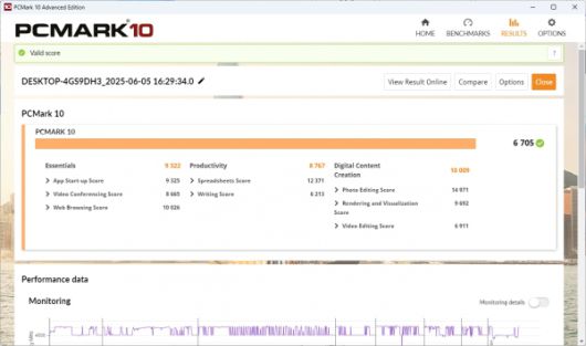 PCMARK 10 벤치마크에서는 6,705점을 기록했다. 다양한 생산성 작업에 적합한 높은 점수를 기록했다.