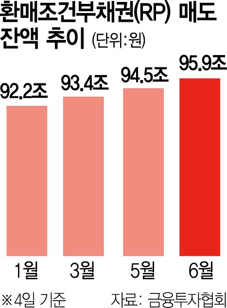 5일 금융투자협회에 따르면 증권사 대고객 RP 매도 잔액은 4일 기준 95조 9122억 원으로 2021년 6월 23일(95조 9366억 원) 이후 3년 11개월여 만에 최고치를 기록했다. 역대 최고치를 기록했던 2021년 6월 17일의 96조 4660억 원과 비교해도 불과 5000억 원가량 못 미치는 수준이다. RP 잔액은 지난달 중순 93조 원대에서 계속해서 늘고 있어 추세대로라면 최고치 경신 가능성이 유력한 상황이다.