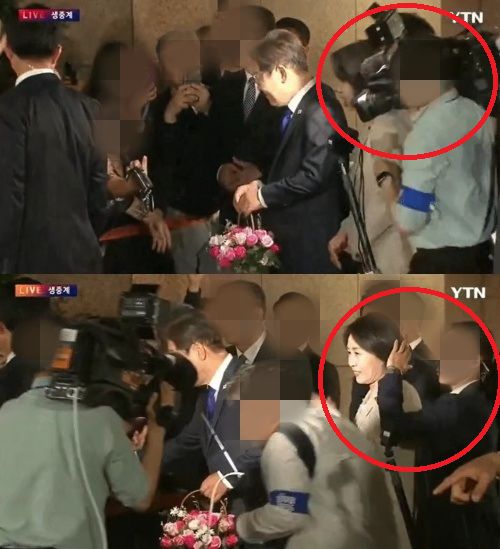 그 순간 당황한 영부인이 머리를 만지면서 놀랐지만, 이내 머리카락을 정리하고 지지자에게 인사를 이어갔다. 이를 본 경호원도 급하게 김혜경 여사를 보호하면서 손으로 감쌌지만, 해당 기자는 사과는커녕 자리를 잡고 촬영하기에 바빴다.