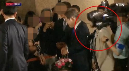 이재명 대통령과 김혜경 여사의 이동 장면은 각종 방송사 카메라로 생중계 됐는데, 이때 문제의 행동이 포착됐다. MBN 영상 취재 기자가 이재명과 지지자들의 인사를 찍기 위해 급하게 움직였고, 그 사이에 김혜경 여사가 있었다. 그러나 피해가지 않고 MBN 기자는 손으로 김혜경 여사의 왼팔을 잡고 밀어내더니, 급기야 카메라 마이크로 여사의 머리까지 쳤다.