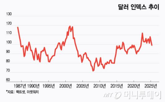 그러나 올해 들어서는 트럼프 대통령이 관세 인상을 통해 글로벌 무역 질서를 재편하려 하면서 급격한 하락세로 돌아섰다. 달러 인덱스는 올들어 8.8% 떨어졌다. 다우존스 마켓 데이터에 따르면 달러 인덱스의 올들어 하락률은 1980년대 중반 이후 같은 기간 중 가장 큰 것이다.