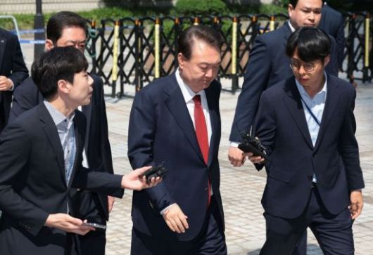 윤석열 전 대통령이 26일 서울 서초구 서울중앙지방법원에서 열린 내란 우두머리 혐의ㆍ직권남용 권리행사 방해 혐의 사건 5차 공판에 출석하고 있다. 사진공동취재단 |