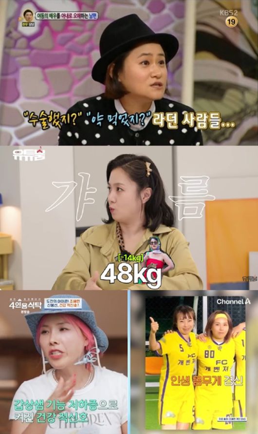 박나래는 최근 14kg을 감량했다며 34%였던 체지방을 22%까지 줄였다고 설명했고, 신봉선은 "가장 많이 쪘을 때보다 체지방만 11.5kg 날렸다. 근손실 없이. 갈비뼈가 보였다"라고 밝혔다. 단식하지 않고 장기간에 걸쳐 식이요법과 운동을 병행한 그는 갑상선 기능 저하증으로 인한 건강 이상 때문이라고 설명했다.