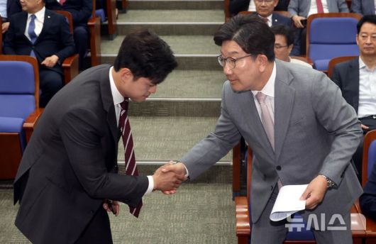 [서울=뉴시스] 조성봉 기자= 김용태 국민의힘 비상대책위원장과 권성동(오른쪽) 원내대표가 5일 오전 서울 여의도 국회에서 열린 의원총회에서 악수를 하고 있다. 2025.06.05. suncho21@newsis.com |
