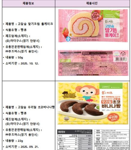 고칼슘 딸기크림 롤케이크 용량은 50g으로 소비기한은 올해 10월 12일이다. 고칼슘 우리밀 초코바나나빵 용량은 22g, 소비기한은 9월 21일이다.