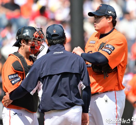 그런데 안현민을 상대로 초구 볼을 던진 류현진이 몸 상태에 이상을 호소했다. 트레이닝 코치와 한참을 얘기하던 류현진은 결국 조동욱과 교체되며 이날 경기를 일찍 마무리했다.