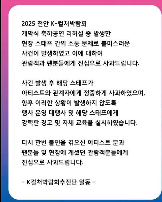 결국 2025 천안 K-컬처박람회 추진단은 5일 공식 입장문을 통해 “현장 스태프 간의 소통 문제로 불미스러운 사건이 발생했다”며 “해당 스태프는 아티스트와 관계자에게 정중하게 사과했고, 향후 이러한 상황이 재발하지 않도록 강력한 경고 및 자체 교육을 실시했다”고 공식 사과했다.