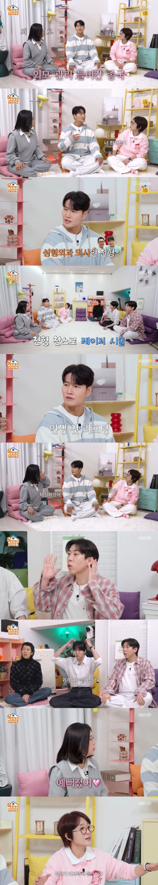이에 김종국은 "우리 형이 성형외과 의사다. '병원에 레이저 많은데 그냥 와라'고 해서 한번 갔다. 그래서 인생 첫 리프팅을 했다"며 "다르냐"고 했다.