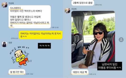 이어 미자는 가족 단체 채팅방에서 나눈 메시지도 캡처해 공개했다. 전성애는 "아들은 왜 이렇게 잘 생겼냐고 하길래 엄마 닮았다고 했더니 아버지는 머리는 없어도 미남이시라고 하네"라며 스위스 여행 중 겪은 일을 가족들에게 전했다. 이에 장광은 "잘 봤구만 뭐"라고 답장을 남기며 흐뭇함을 드러냈다.